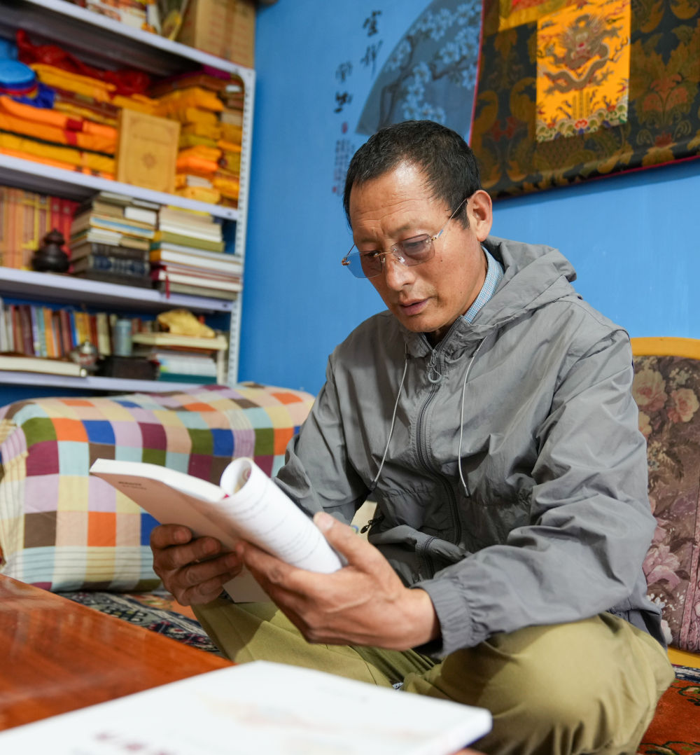 洛桑麦朗在家中翻看服装制作相关书籍(8月15日摄)。新华社记者 晋美多吉 摄