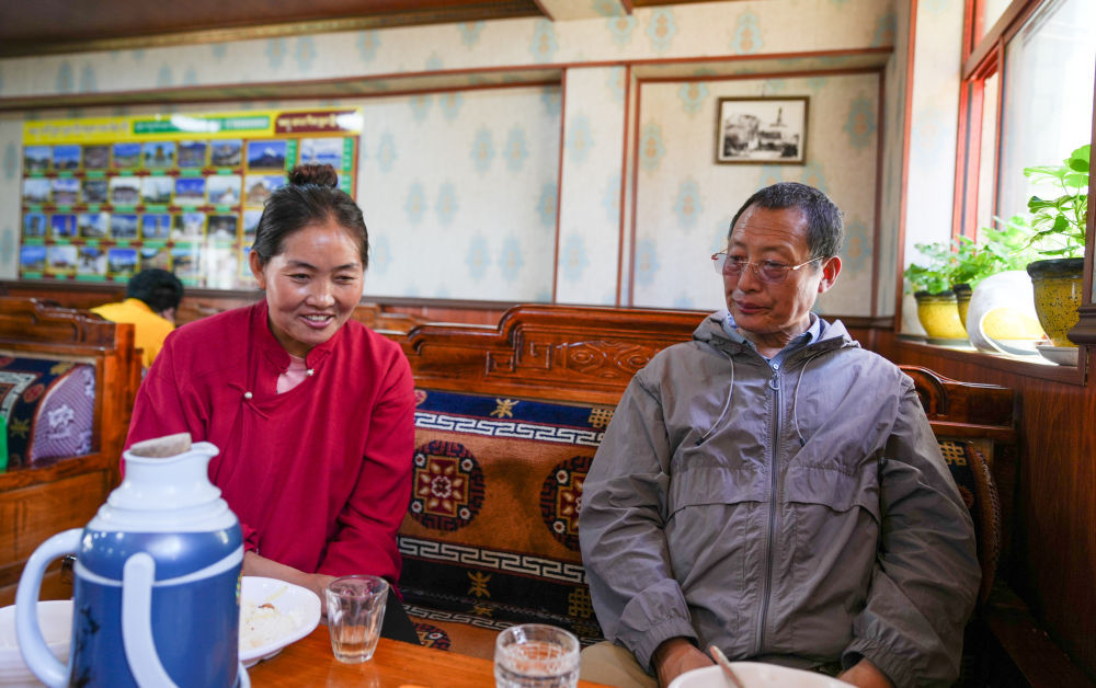 洛桑麦朗(右)和毕业学生在甜茶馆吃午饭,同时现场回答学生的问题(8月15日摄)。新华社记者 晋美多吉 摄