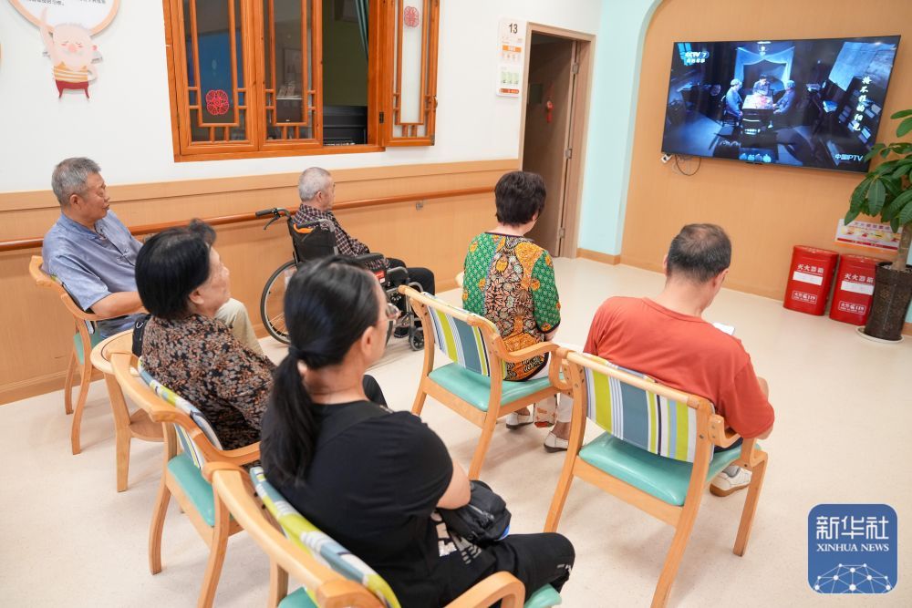 9月1日,几位老人在成都市营门口街道综合为老服务中心的公共空间看电视。