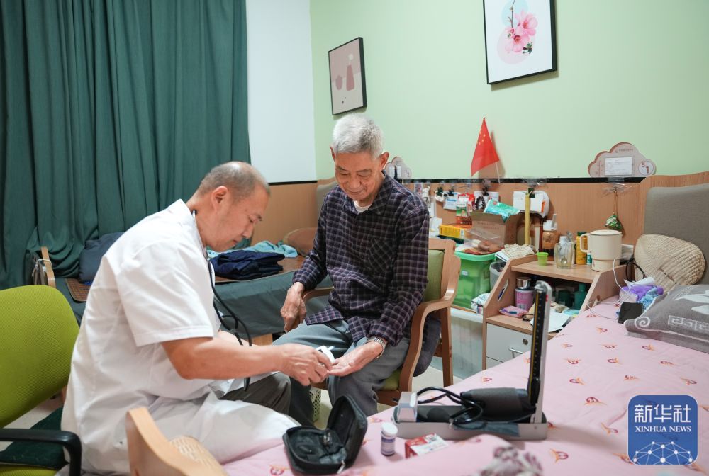 9月1日,一名医生给住在成都市营门口街道综合为老服务中心休养房间的黎肇瑞老人(右)检查身体。