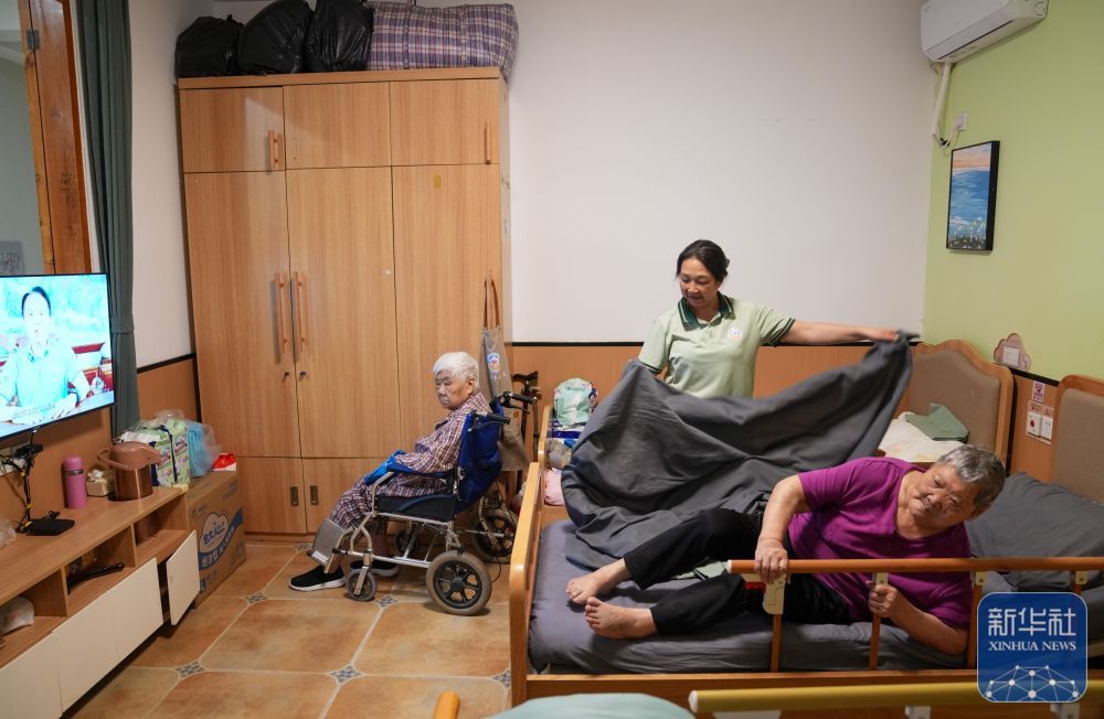 9月1日,一位工作人员在成都市营门口街道综合为老服务中心照顾老人范淑玉(右)、陈淑君(左)。