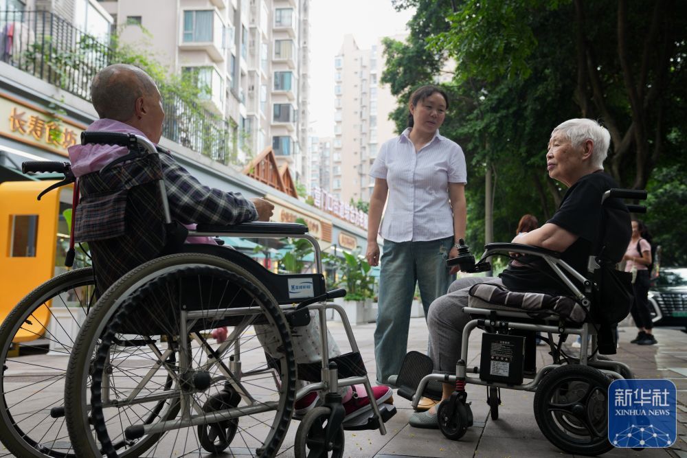 9月1日,工作人员吴映梅(中)在成都市营门口街道综合为老服务中心门口与两位老人交流。