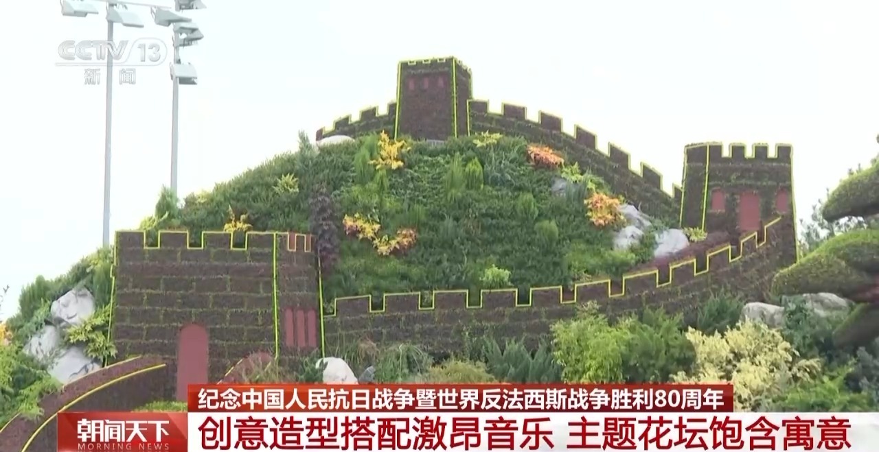 西南角的“众志成城”主题花坛以万里长城作为主景,它既是抵御外敌、团结抗争的一个国际文化符号,也体现了万众一心、一往无前的民族担当。