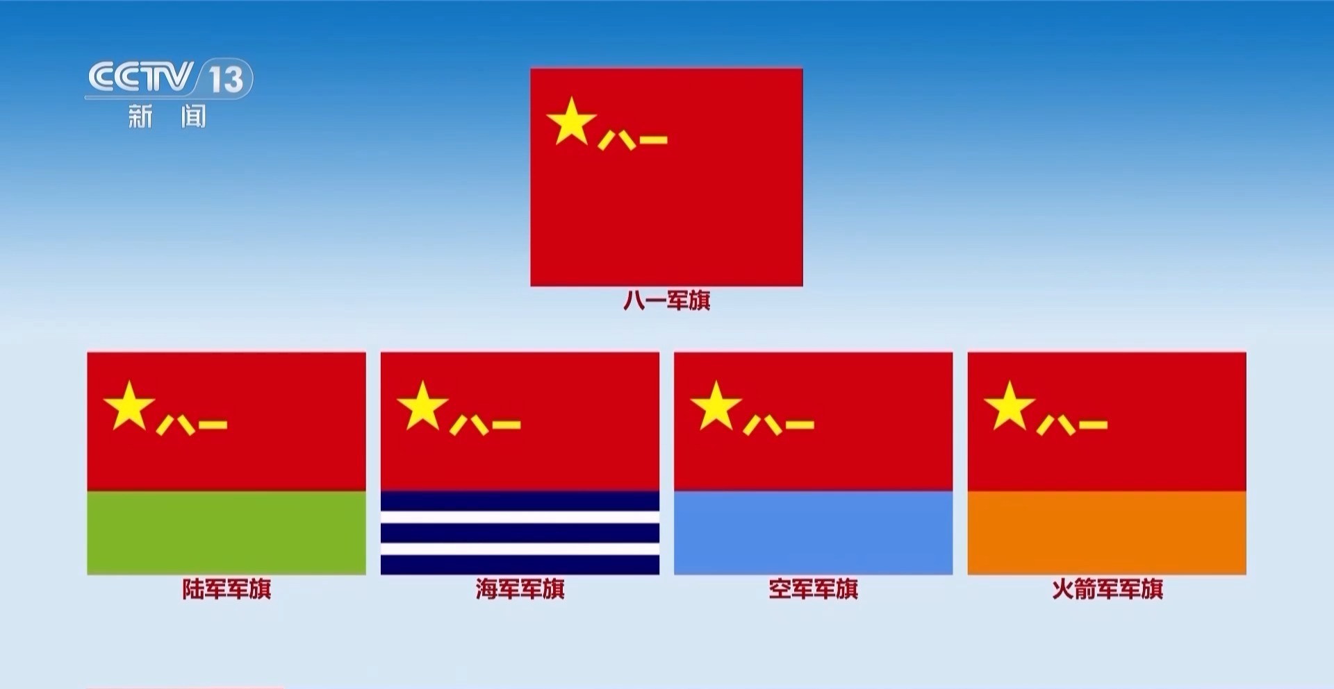 军事航天部队、网络空间部队、信息支援部队、联勤保障部队军旗,以八一军旗为基础设计,布局延续军种军旗上下设置、黄金分割的基本模式,选用具有相应兵种领域特色、辨识度高的主色调,加以辅助性条纹,在内涵意蕴、风格式样上总体与陆军、海军、空军、火箭军军旗一脉相承、体系协调。