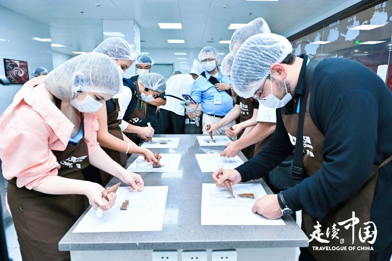 在巧克力博物馆,12位外国记者兴致勃勃地参观了巧克力制成的展示不同历史时期风貌的展品,一比一还原的“巧克力兵马俑”、等比例缩小的“巧克力钟楼”等展品令记者们流连驻足,感叹历史与现代技艺的融合。参观结束后,外国记者们还了解了巧克力温控设备的工作原理,亲身体验了纯手工巧克力制作流程,亲手制作的巧克力别样香甜。