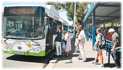 在南非立法首都开普敦,人们在公交总站登上一辆比亚迪电动公交车。新华社发