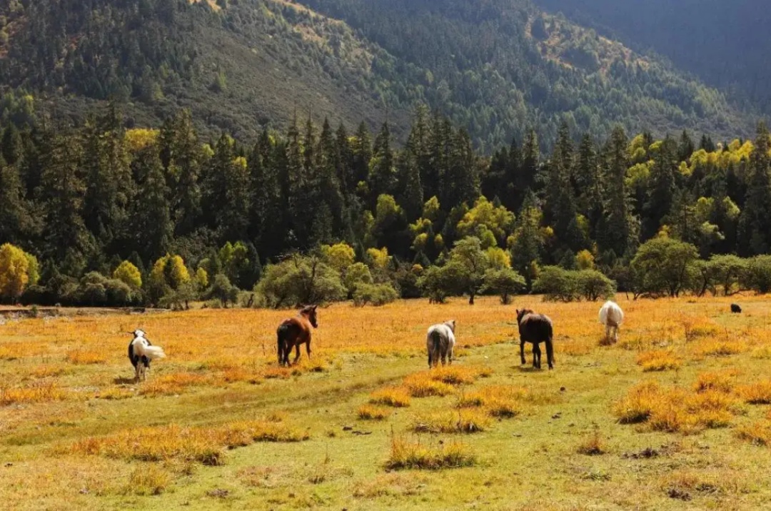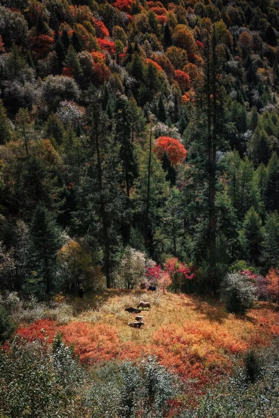 终年苍翠的密林中,夹杂着点点橙黄搭配着山下的金黄草甸,为总是深沉的颜色平添了一丝温暖的色调。