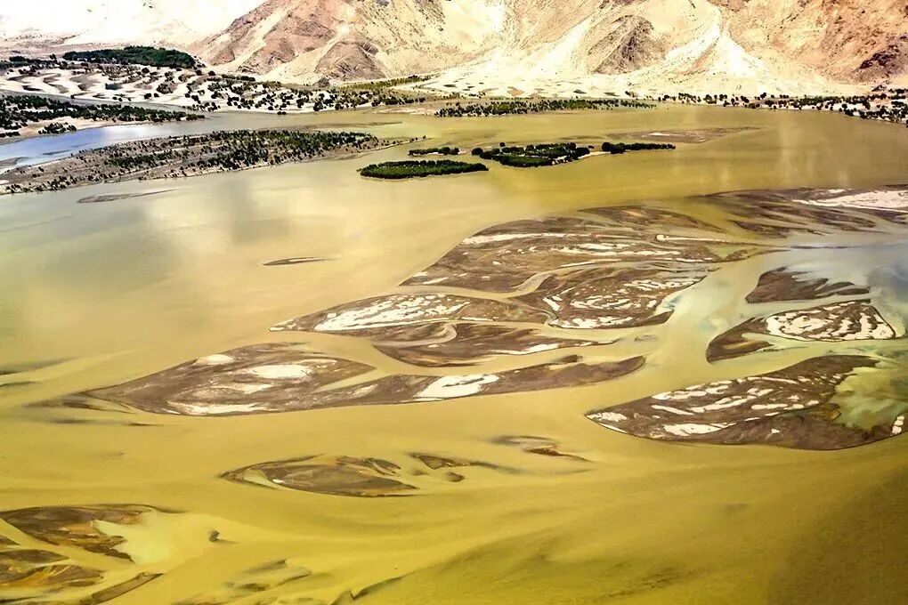 从空中俯瞰,江水仿佛静止了一般任由天空和大地在水面上肆意泼墨作画。