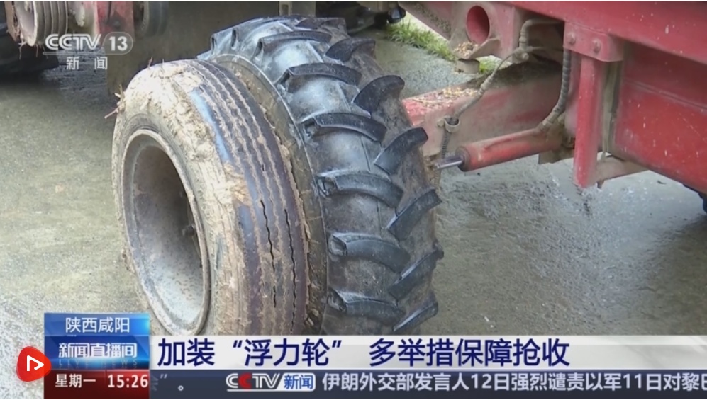 日前,在咸阳市泾阳县的一处机收现场,一台台履带式收割机在松软的泥地里来回穿梭,完成收割、脱粒等工作。而对于轮式联合收割机无法下地的问题,当地农机部门指导农户在收割机原有的轮胎外侧加装“浮力轮”,增加轮胎整体宽度,增强在湿软田地中的通过性。