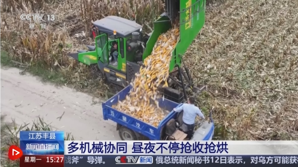 江苏北部地区自9月下旬以来阴雨天气不断,为应对天气带来的秋收困难,当地加大机械收割、烘干力度,保障玉米、大豆收获。