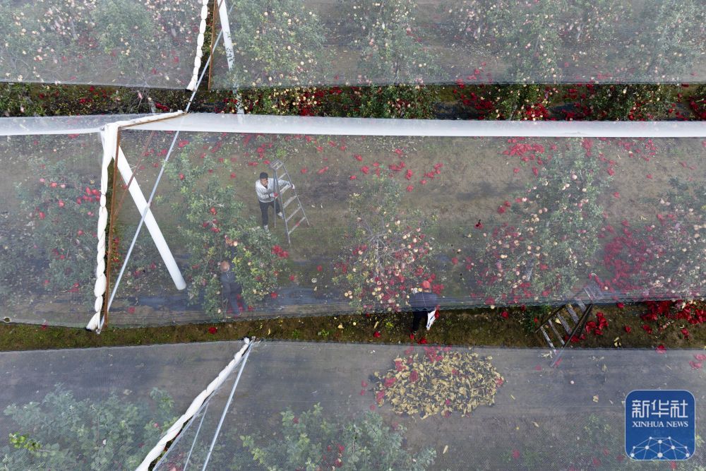 ↑ 10月17日,果农在延安市宝塔区桥沟街道烟洞沟村苹果园内摘掉苹果套袋(无人机照片)。新华社记者 邵瑞 摄