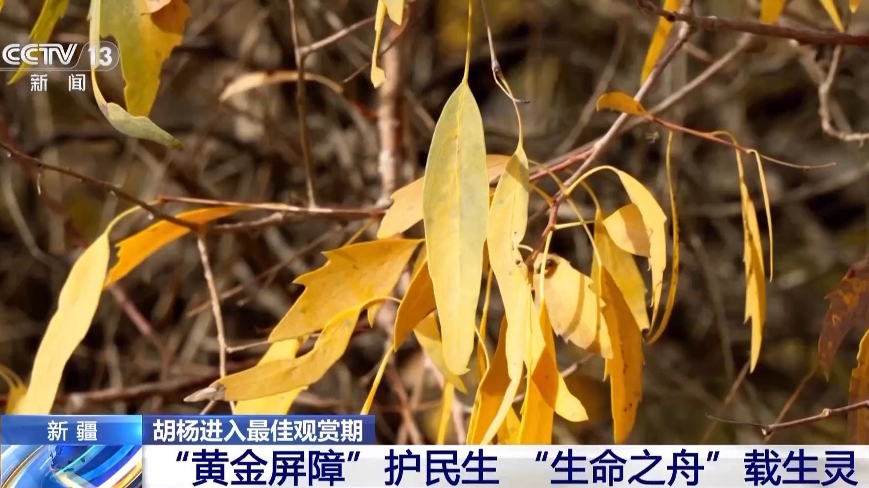 总台记者 周宇:新疆沙雅县拥有着全世界面积最大的野生胡杨林。这里的胡杨林进入了最佳的观赏时期。当我们走近胡杨,会发现同一棵树上拥有着不同形状的叶子: