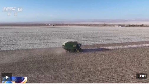 托克逊县库米什镇英博斯坦村党支部书记 邓琛:已经进入了采摘高峰期,我们提前联系采棉机,从采摘价格,采收质量,采棉机调配等方面入手,有效保障了棉花采收能顺利进行。
