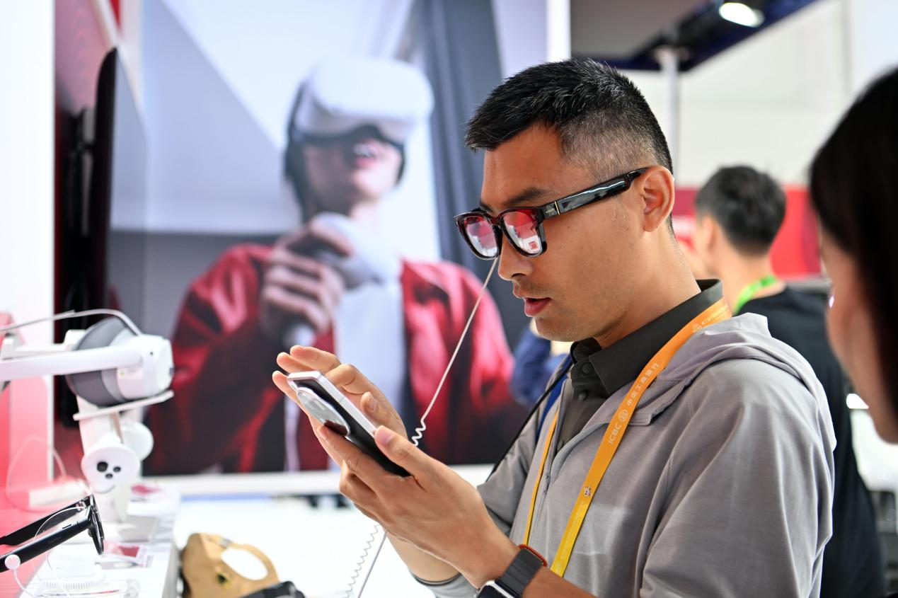 在第三届中国国际供应链促进博览会上,参观者体验国产AI眼镜。人民网记者 翁奇羽摄