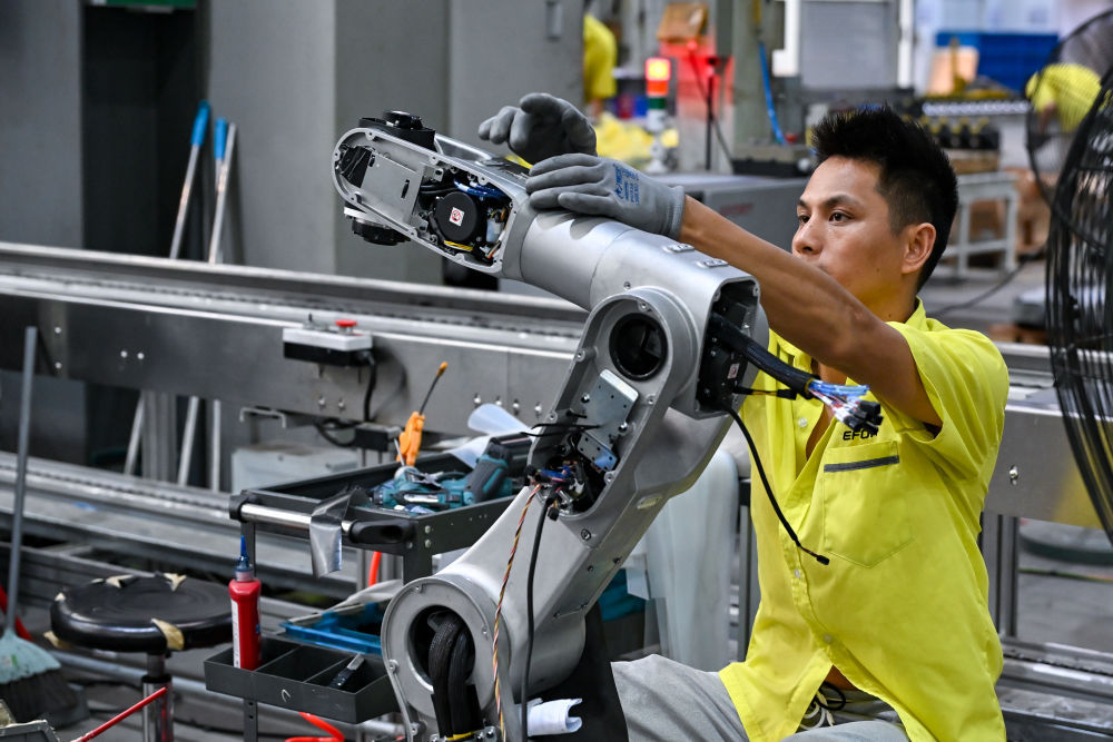 2025年7月3日,在位于安徽省芜湖市的埃夫特智能机器人股份有限公司内,工作人员在装配机器人。新华社记者张铖摄