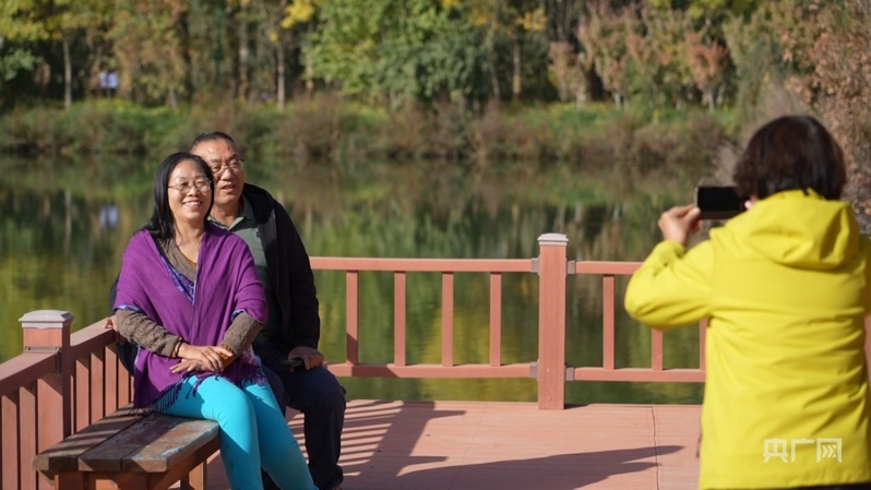 游客在湿地公园拍照留念 (央广网记者丁安 摄)