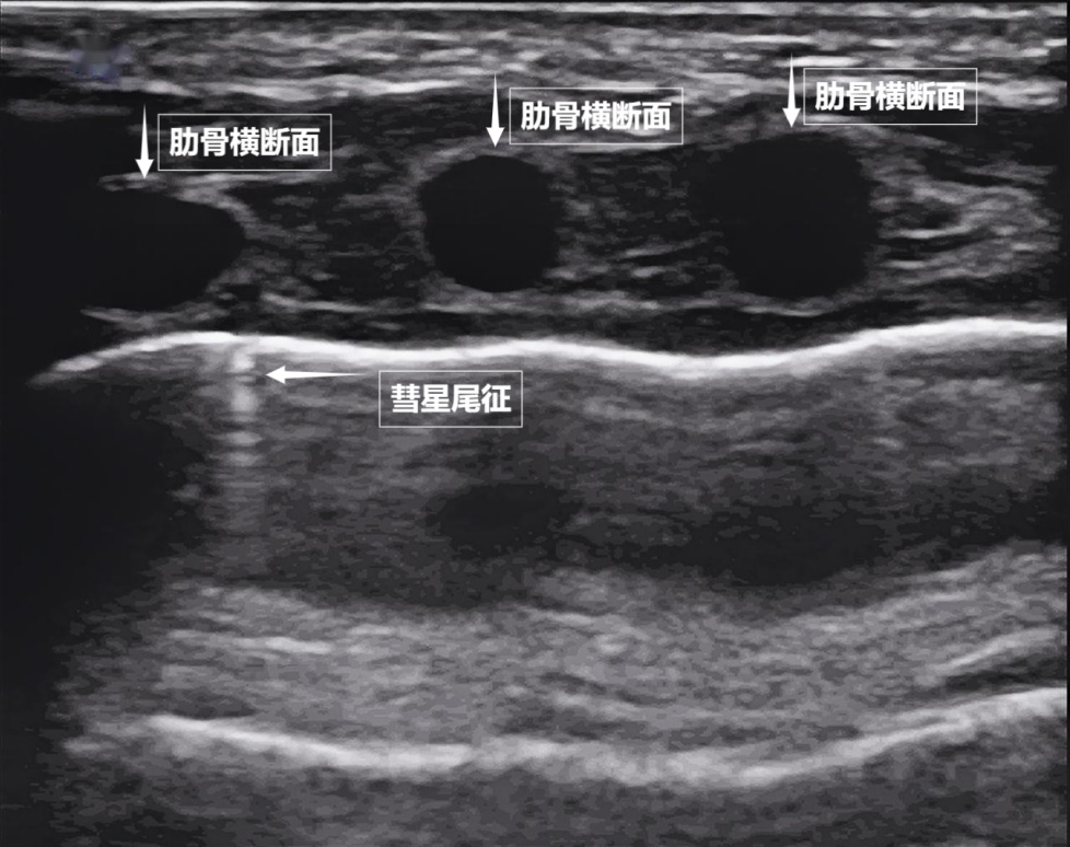 如果我们把超声图像调成实时动态模式,把“照片”变成“电影”,更神奇的一幕出现了。随着呼吸,胸膜线会随胸廓运动轻柔滑动,这就是“肺滑动征”。它意味着肺与胸壁正紧密相依、自由顺畅地呼吸。若肺与胸壁间有气胸或胸腔积液,这种滑动会消失。有时,在胸膜线下方还会出现细小的亮白色闪烁点,称为“彗星尾征”(见下图)。其少量、孤立出现时,通常是正常肺小叶间隔的反射,无需担心。