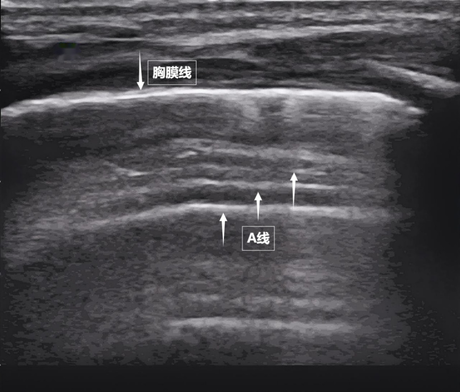 当声波穿过胸壁肋骨缝隙,首先会遇到紧贴肺表面的光滑薄膜——壁层胸膜和脏层胸膜。两者紧密相贴,中间没有多余的气体或液体。它们在屏幕上呈现为一条明亮、光滑的水平线,共同构成了胸膜线。这条线就是肺的“海岸线”。在它的下方,由于肺泡内大量气体对声波的强烈反射,会出现一系列与胸膜线平行的、等间距的、重复出现的明亮平行线,像海浪般不断向屏幕深处延伸,这就是A线(见下图)。A线是正常含气肺部的典型标志。它的存在直接提示肺表面含气充足,胸膜腔内无异常积液或气体。