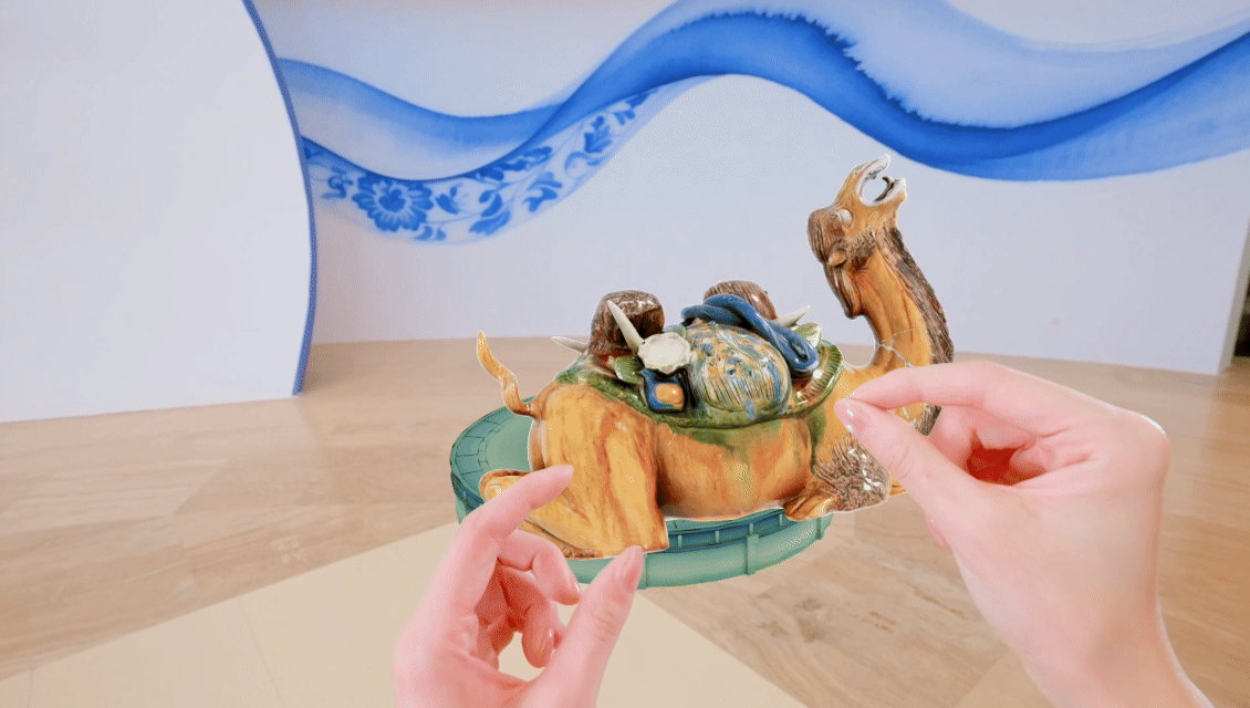 “这款MR眼镜使用的就是3D技术,该技术能够清晰地将文物的纹饰纹样、颜色、形制等信息采集下来。戴上MR眼镜后,观众能够放大缩小、旋转文物,增强了观看体验。”李源说。