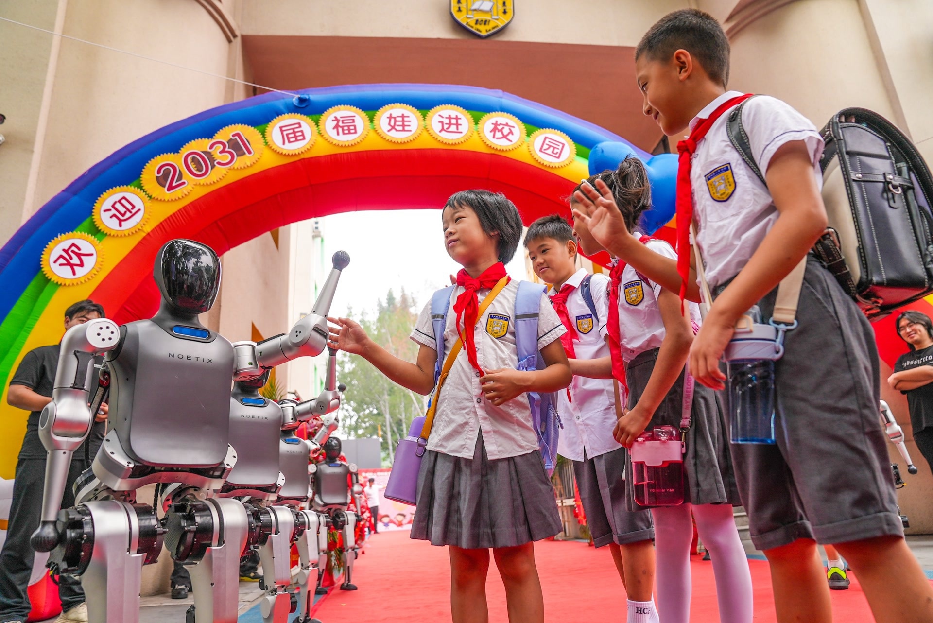 智能机器人与师生共迎新学期。