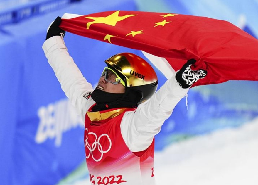 2022年2⽉16⽇,在北京2022年冬奥会⾃由式滑雪男⼦空中技巧决赛中,中国选⼿⻬⼴璞获得冠军。新华社记者 许畅 摄