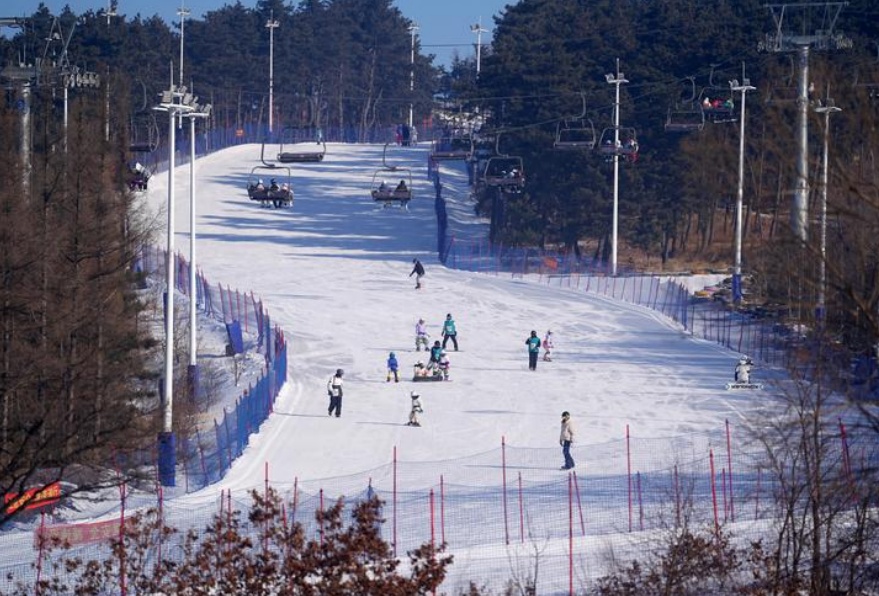 滑雪爱好者在⻓春天定⼭滑雪场滑雪。新华社记者 陈晔华 摄