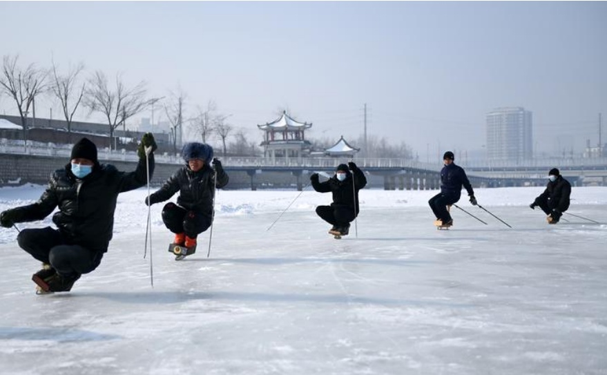市⺠在⻓春市伊通河畔的冰场上滑单⼑冰⻋。新华社记者 颜麟蕴 摄
