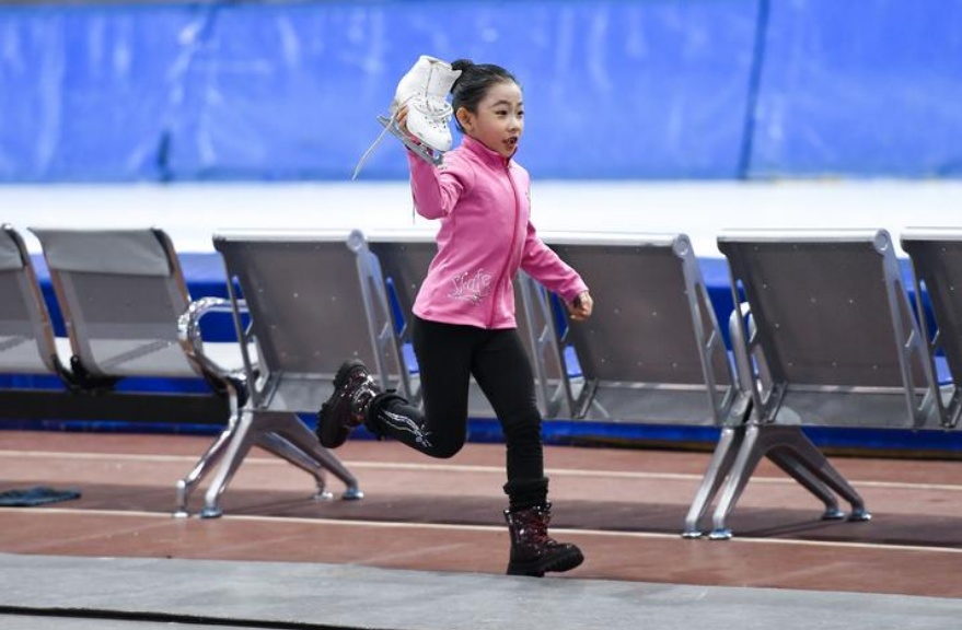在吉林省“百万⻘少年上冰雪”推⼴活动上,⼀名花样滑冰⼩选⼿举着冰鞋跑向她的教练。新华社记者 许畅 摄