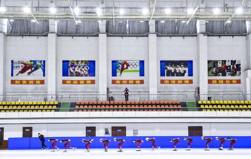 ⻘少年运动员在⻓春市滑冰馆进⾏训练。新华社记者 许畅 摄