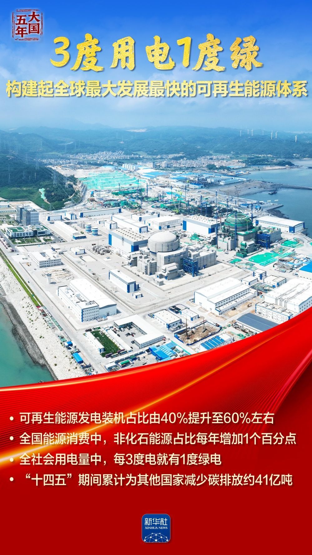 全社会用电量中,每3度电就有1度绿电;风电光伏装机历史性超过火电,新能源发电增量占全国新增发电量近一半;全国统一电力市场加快构建,塞北的风点亮湾区的灯……“十四五”期间,我国能源建设逐“绿”向“新”,筑牢能源安全的坚实底座,绘就民生幸福的温暖底色,夯实“双碳”目标的实现基础。