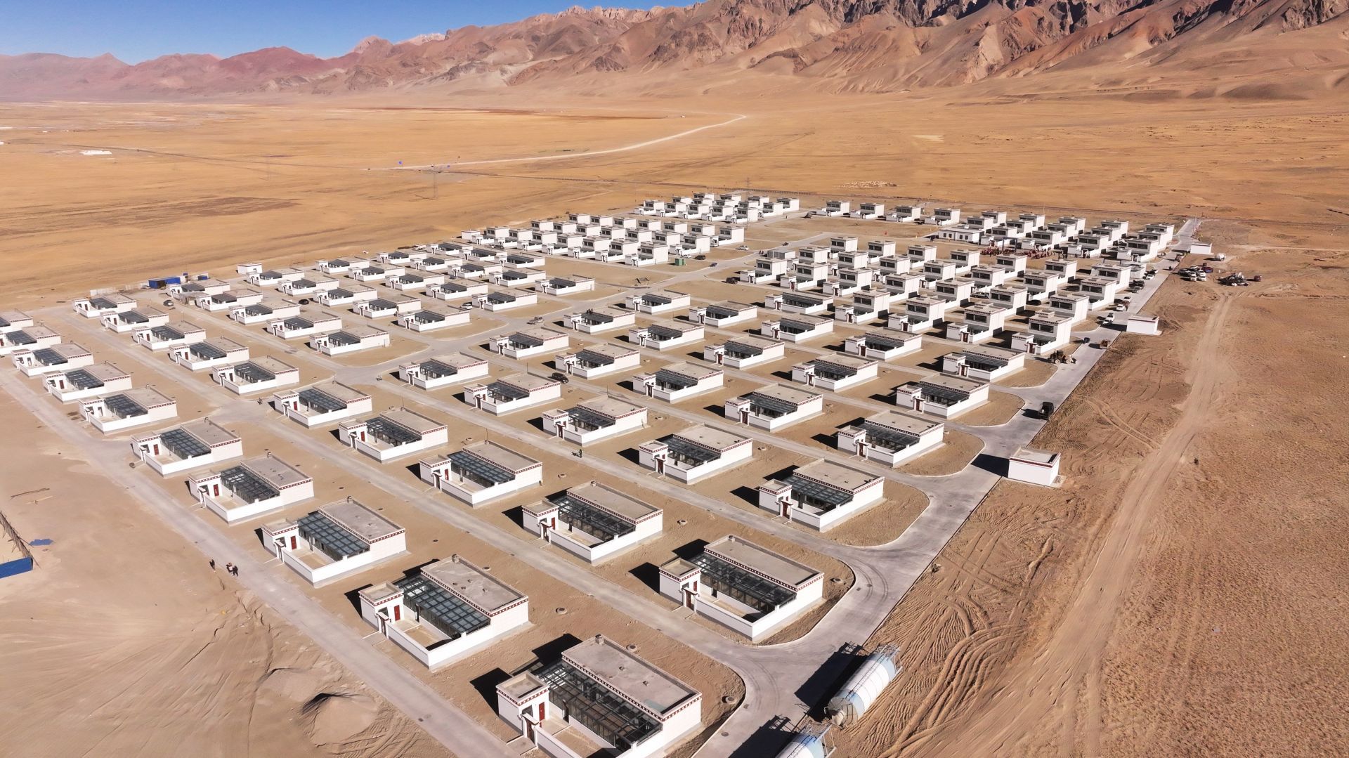 图为茶措村新居建筑风格融合藏式元素,白墙红檐搭配玻璃暖廊,在蓝天与远山的背景下,尽显高原新村美丽宜居。改则县融媒体中心摄