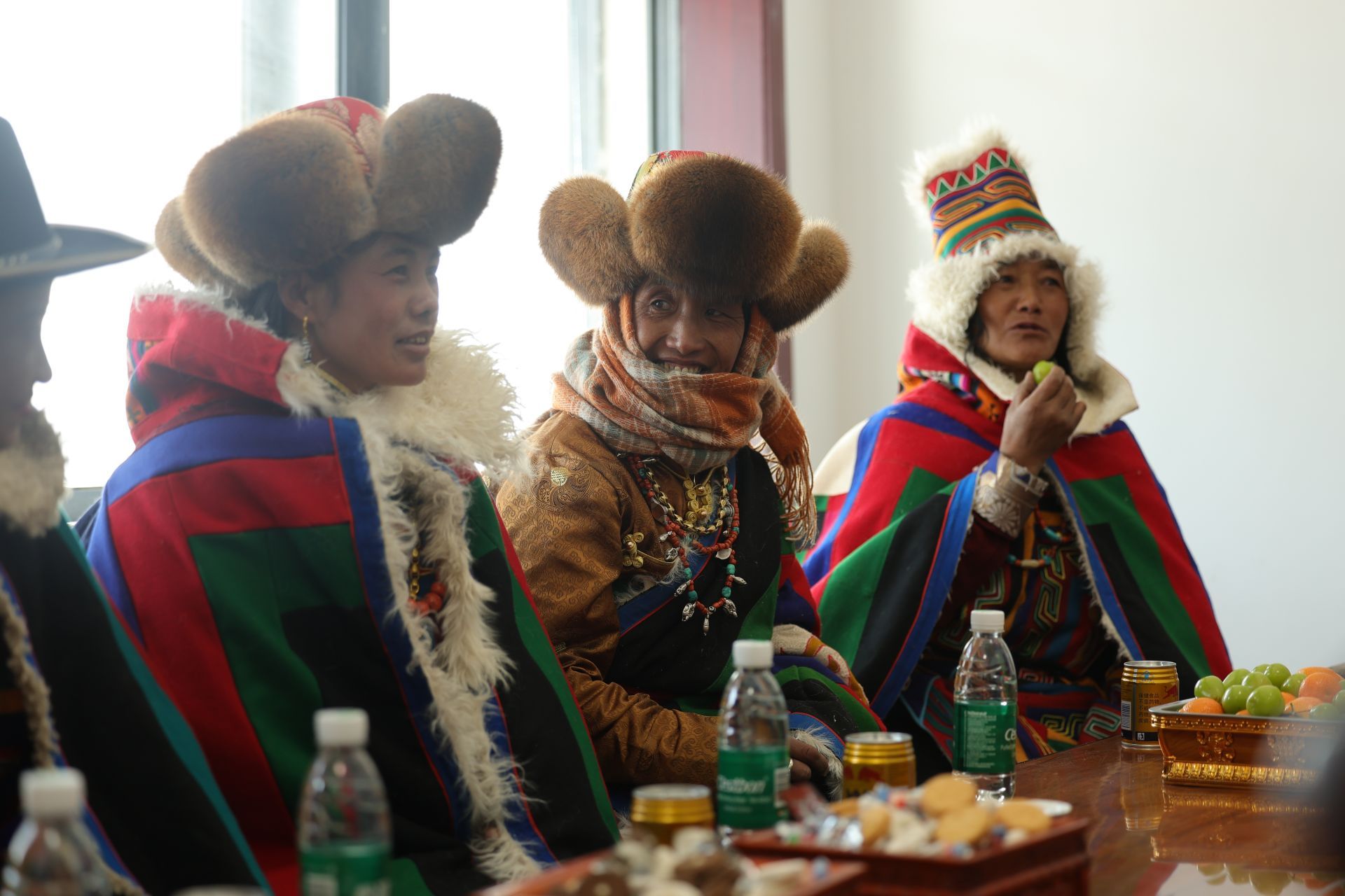 图为村民身着特色民族服饰,围坐在一起,桌上摆放着水果、饮品,脸上满是搬入新居的幸福笑容。改则县融媒体中心摄