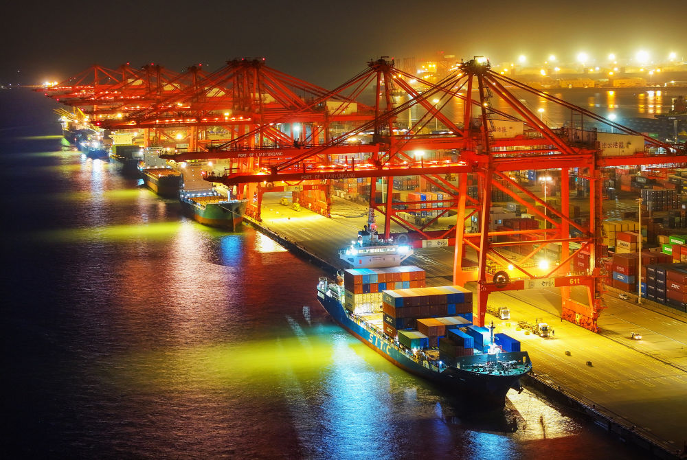2024年12月14日晚拍摄的江苏省连云港港集装箱码头(无人机照片)。新华社发(王健民摄)