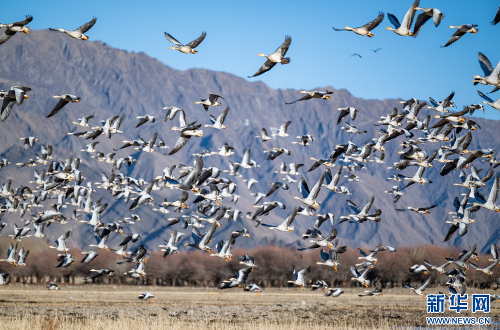 这是11月26日在西藏拉萨市林周县境内拍摄的斑头雁。新华网 旦增努布 摄