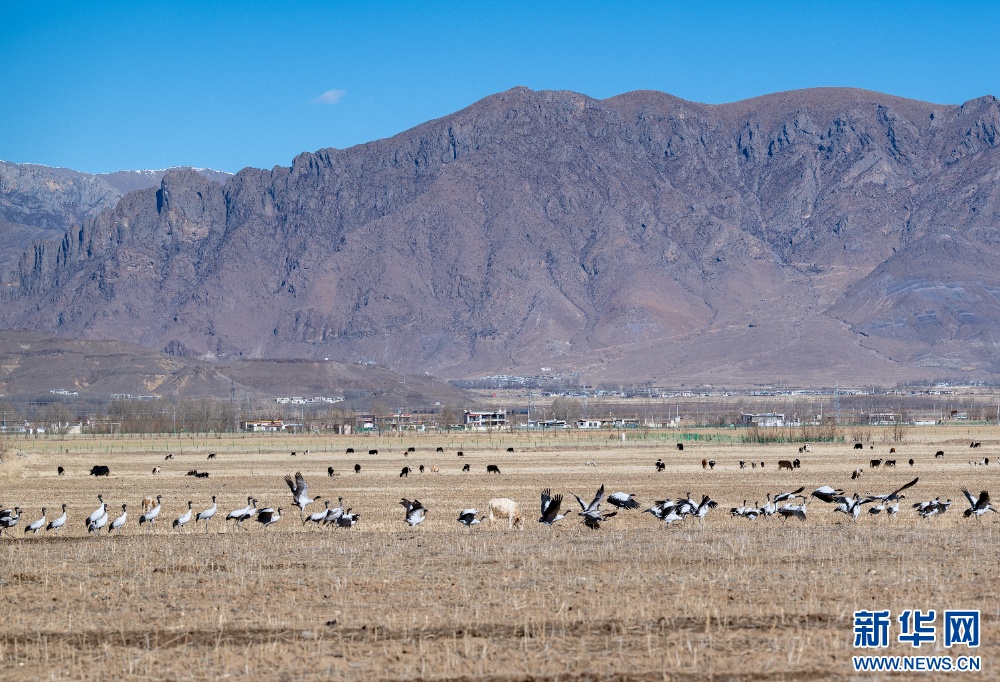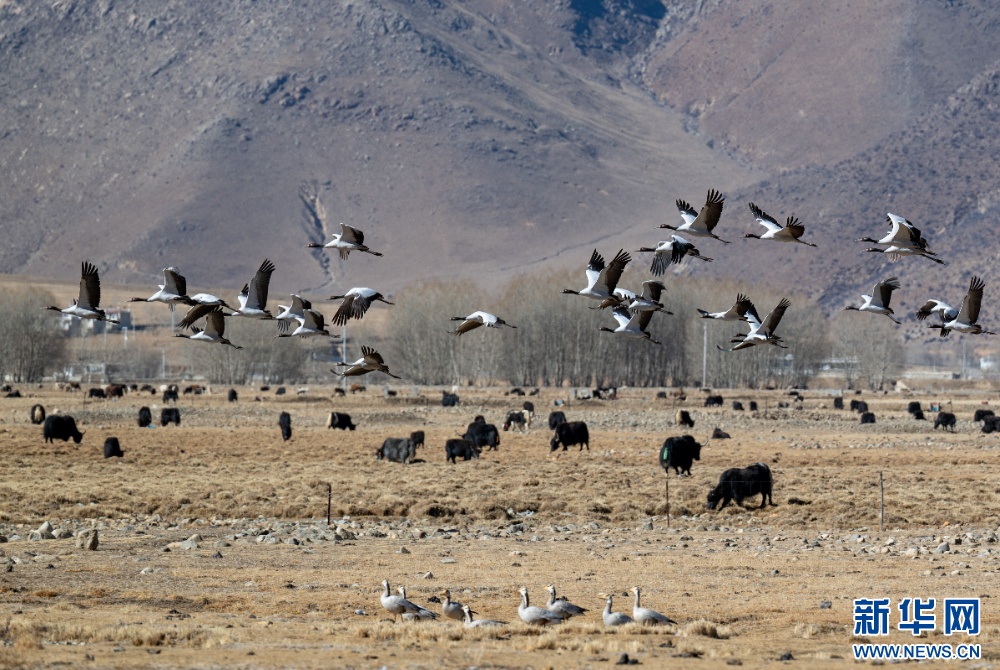这是11月26日在西藏拉萨市林周县境内拍摄的黑颈鹤和斑头雁。新华网 旦增努布 摄