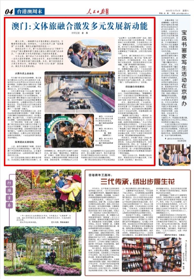 今年以来,澳门举办了乒乓球世界杯、国际龙舟赛等一系列大型体育赛事,并配合音乐节、美食节等精彩文旅活动,吸引游客来澳门游玩观赛。未来,澳门将积极参与大湾区体育合作,持续推动“体育+文化+旅游”深度融合,激发多元发展新动能。