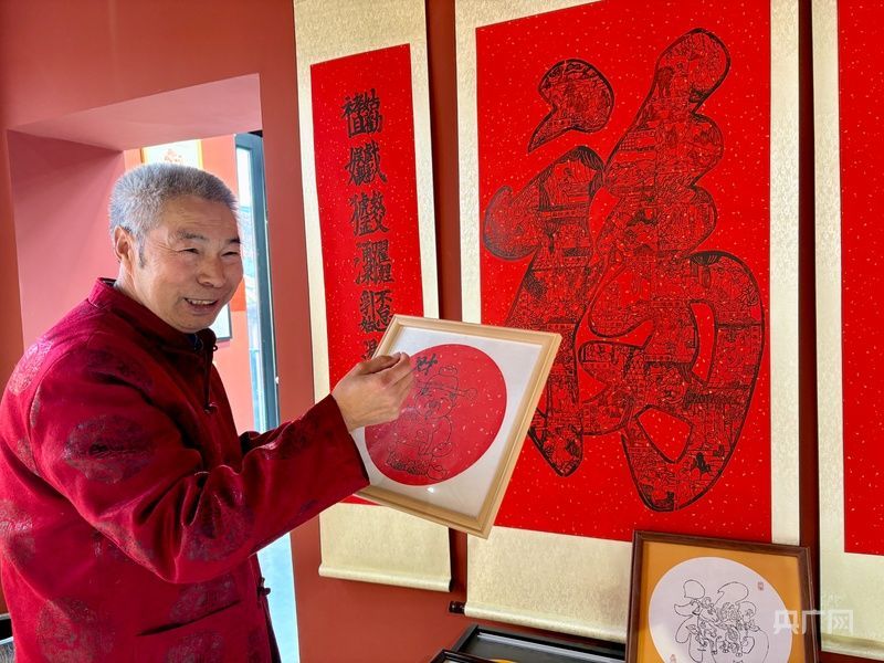 在耿建社的画店与非遗展示中心,“字画交融”的木版年画吸引游客驻足:“寿”字里藏着二十四孝图,生肖纹样栩栩如生,数字动画为年画赋予新解读。传统与创新在这里交织。