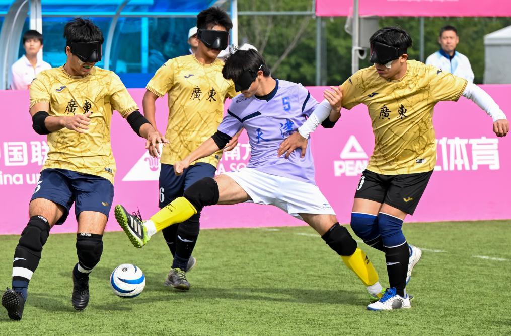 12月14日,在广州举行的全国第十二届残疾人运动会暨第九届特殊奥林匹克运动会盲人足球项目男子组小组赛中,天津队1:0战胜广东二团队。图为天津队球员范海林(右二)在比赛中突破。新华社记者 陈浩明 摄