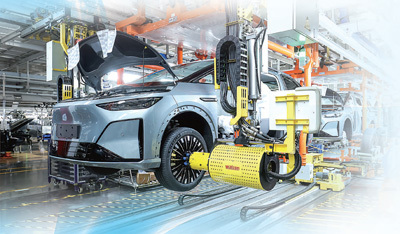 小鹏汽车广州基地总装车间,小鹏X9超级增程车正在组装下线。胡嘉颖摄