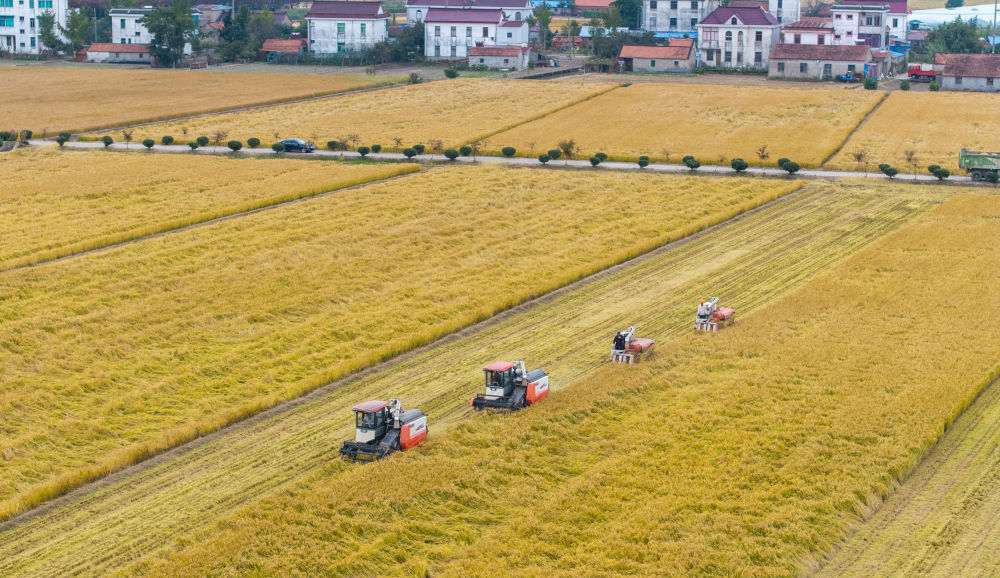2025年10月30日,在江苏省南通市通州区十总镇育民村高标准农田里,村民驾驶农机收割水稻(无人机照片)。新华社发(翟慧勇摄)
