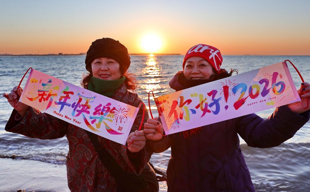 2026年1月1日清晨,市民在河北省秦皇岛市海港区金梦海湾海滩观看日出,迎接新年。新华社发(曹建雄 摄)