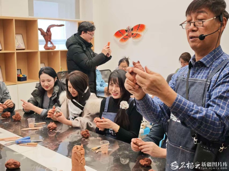 热雪新疆e起来·一路开“新”网络名人代表,在克拉玛依市文化馆体验非遗技艺泥塑。石榴云/新疆日报记者 宋海波摄