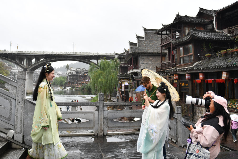 2025年11月6日,外国游客身着“中国风”服装在凤凰古城拍照、游玩。新华社记者 陈振海 摄