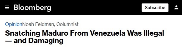 哈佛大学法学教授诺亚·费尔德曼(Noah Feldman)在彭博社网站发表评论指出,美国此次军事行动,不仅违反国际法,亦背离美国国内法律框架。此次行动及美方公开表示将“接管”委内瑞拉并控制其石油资源的言论,均构成对国家主权与自主治理这一国际法基本原则的公然挑战。
