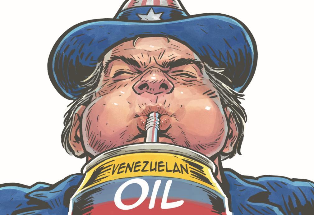 石油是美国对委内瑞拉展开军事行动的理由之一。(漫画作者:中国日报 蔡朦)