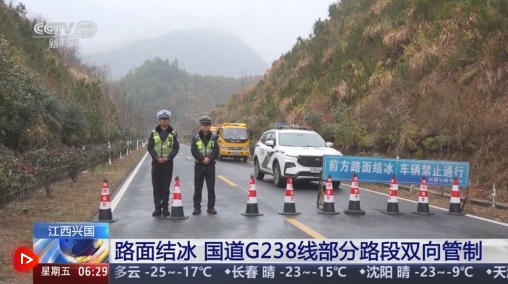 连日来,受强寒潮天气影响,江西赣州兴国县气温骤降。在国道G238线兴国县崇贤乡贺堂村路段,因受低温雨雪冰冻天气影响,路面结冰不具备安全通行条件。