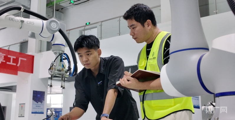谢盛(左)和企业技术员讨论智能化生产AI模型(央广网记者 胡斐 摄)