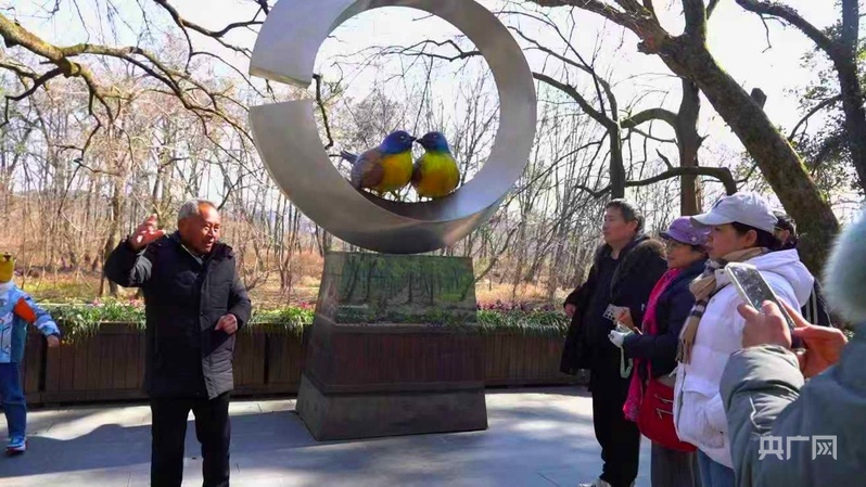 石门村村民为游客讲解蓝冠噪鹛生活习性(央广网发 戴鸿 摄)