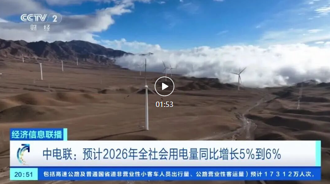 中电联表示,预计2026年我国宏观经济将继续保持平稳增长,拉动电力消费需求平稳较快增长。预计2026年全国全社会用电量10.9万亿千瓦时到11万亿千瓦时,同比增长5%到6%;全年统调最高用电负荷在15.7亿千瓦到16.3亿千瓦。