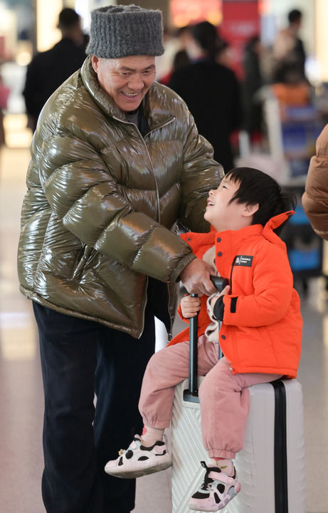 2月2日,在江苏海安站出站口,小朋友跑向前来接站的家人。新华社发(顾彬斌摄)